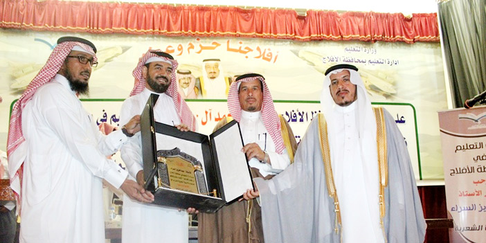 رعى محافظ الأفلاج زيد بن محمد آل حسين ليلة البارحة حفل اختتام النشاط الطلابي بإدارة تعليم المحافظة تحت عنوان «أفلاجنا حزم وعزم» الذي اشتمل على 13 برنامجا تضامنا مع مشاركة بلادنا في «عاصفة الحزم» لاستعادة شرعية دولة اليمن وقد تخلل الحفل الذي أقيم على مسرح الإدارة، بحضور مدير التعليم محمد بن مبارك الزايد والمساعد للشؤون التعليمية محمد البشر والكثيرون من مديري ورؤساء الدوائر الحكومية، والأهالي وعدد من القيادات التربوية والتعليمية والإدارية، وطلاب المدارس الكثير من الكلمات وأمسية شعرية والكثير من الفقرات.