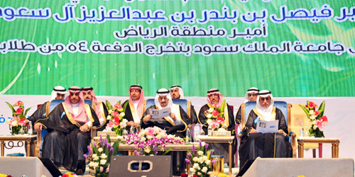 رعى صاحب السمو الملكي الأمير فيصل بن بندر بن عبدالعزيز أمير منطقة الرياض، مساء أمس الأول، حفل تخريج الدفعة (54) من طلاب جامعة الملك سعود، بحضور معالي وزير التعليم الدكتور عزام بن محمد الدخيل، وذلك بصالة الرئاسة العامة لرعاية الشباب (الصالة الخضراء) في الرياض.