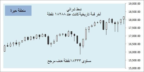 افتتح مؤشر الداوجونز الأسبوع على هبوط، وصلت ذروته إلى مستوى 17733 نقطة، ثم ارتداد إلى مستوى 18205 نقاط، والإغلاق بنمط شرائي فوق الحاجز النفسي رغم سلبية بعض المؤشرات الاقتصادية، لكن ساهم هبوط الدولار بشكل كبير في رفع شهية المخاطرة في أسواق الأسهم. ويتوقع الأسبوع المقبل أن يشهد الداوجونز خروجاً من الحيرة للمسار الصاعد، ويستهدف فنياً قمة سنوية وتاريخية جديدة عند مستوى 18333 نقطة.