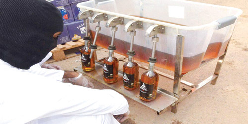 صرح الناطق الرسمي للمديرية العامة لمكافحة المخدرات أنه بناء على ما توفر من معلومات عن وجود شبكة تمتهن تهريب الخمور إلى المملكة وتمكنها من تهريب كمية من الخمور بعد تفريغها من عبواتها المصنعية وإعادة تعبئتها في عبوات مخصصة لسوائل أخرى ذات استخدامات مشروعة وتهريبها والزجاجات المصنعية وملصقاتها وأغطيتها كل على حدة, وإعادة تجميعها داخل المملكة، فقد تم تكليف فرقة أمنية لتكثيف البحث والتحري عن نشاطات هذه المجموعة الإجرامية. وتم ـ بتوفيق الله تعالى ـ تحديد موقع المستودع، المخصص لحفظ المواد المهربة, وإعادة تعبئة الخمور في زجاجاته المصنعية، بمنطقة الرياض ، وإخضاعه للمراقبة ومداهمته خلال وجود عدد من المتورطين في نشاط التهريب بالموقع ، والقبض عليهم وعددهم (8) بينهم سعودي , و(3) من الجنسية الهندية ، و (2) من الجنسية اليمنية ، و(2) مجهولي الهوية. كما تم في المستودع ضبط (18.141) ثمانية عشر ألفاً ومائة وواحد وأربعين زجاجة خمر معدّة للترويج ، وعدد (144.463) مائة وأربعة وأربعين ألفاً وأربعمائة وثلاثة وستين زجاجة خمر فارغة, بالإضافة الى التحفظ على شيكات نقدية بمبالغ مالية كبيرة متعددة يشتبه أن تكون من عوائد الإتجار بالخمور. والله ولي التوفيق .