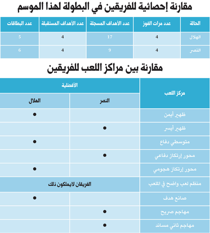 ففي الهلال من المتوقع بناء على المباريات السابقة للفريق تواجد السالم كمهاجم صريح وخلفه بشكل غير ثابت الدوسري عبدالعزيز أو العابد أو الفرج بعض الحالات وهذا يعطي مؤشرا لعدم المركزية للاعب المساند للمهاجم وشخصياً أرى هذا الأمر ايجابي كما ان هذا الخط لديه خيارات أخرى في دكة البدلاء متمثلة في هداف الفريق ناصر الشمراني واللاعب الشاب خالد كعبي.