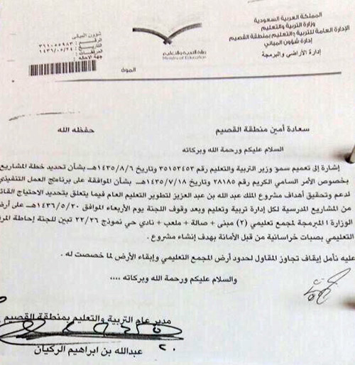 ونشير إلى أن الأمر السامي الكريم رقم 4 /1071 بتاريخ 1403/5/7 ينص على إبقاء المرافق على ماخصصت له والأمر السامي رقم 4د/10387 بتاريخ 1413/7/10 الذي ينص على عدم تغيير استخدامات المخططات المعتمدة باعتبارها وثائق رسمية يجب احترامها وهو ما احترمته وطبقته الإدارة العامة للتعليم بالمنطقة.