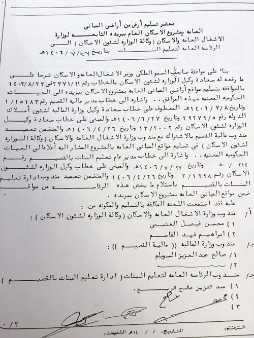 وأكدت إدارة تعليم القصيم أنه استنادا للثبوتيات الرسمية أن الأمانة قامت متعمدة بالاستيلاء على أرض مخصصة لإدارة التعليم، وفقا لمحضر تسليم وزارة الأشغال العامة والإسكان (سابقا) الأرض للتعليم بالمنطقة بتاريخ 1406/7/27هـ وبمعرفة ودراية من أمين المنطقة، الذي وعد لمرتين متتاليتين بإيقاف التعدي؛ اعترافا بأن الأمانة لا تملك الحق بضم ماخصص للتعليم، ليكون ضمن الحديقة النسائية التي تمثل أحد مشاريع الاستثمار للأمانة، وهي الآن تدعي بتعدي التعليم عليه.