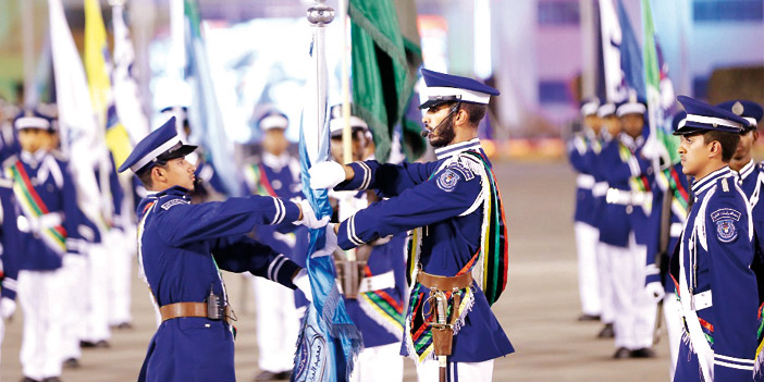 وقبل إعلان النتائج تم تسليم راية المعهد من الرقيب السلف إلى الرقيب الخلف، ثم أداء الخريجين القسم حيث ألقى قائد جناح الطلبة المكلف المقدم صقر بن سعد المطيري القسم وردده الخريجون من بعده.