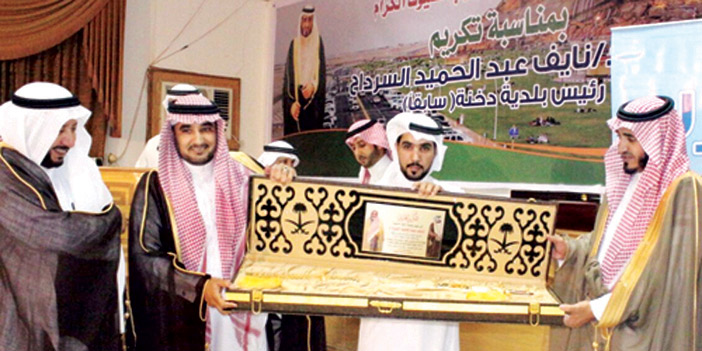 شرف محافظ محافظة الرس محمد العساف الحفل التكريمي الذي أقامه أهالي مركز دخنة لرئيس البلدية السابق نايف عبدالحميد أبو سرداح الذي تم نقله مؤخراً رئيساً لبلدية محافظة ضرية، وذلك بحضور رئيس المركز عبدالله بن سعود آل طالب ورئيس بلدية عفيف محمد الغريب وعدد كبير من شيوخ القبائل ورؤساء المراكز وأعيان وأهالي دخنة، حيث أقيم حفل خطابي بهذه المناسبة بُدئ بتلاوة آيات من الذكر الحكيم ثم كلمة الأهالي ألقاها عضو المجلس المحلي بالمحافظة سليمان السحيم بعدها شاهد الجميع عرضاً مرئياً لمنجزات البلدية في رئاسة السرداح، تلا ذلك عدة قصائد شعرية ألقاها نخبة من الشعراء بهذه المناسبة ثم قدمت هدية الأهالي ورئيس المركز وتلاها تقديم الهدايا من الشيوخ ومدراء الدوائر الحكومية والمؤسسات والأفراد والتقطت الصور التذكارية ثم تناول الجميع طعام العشاء المعد بهذه المناسبة.