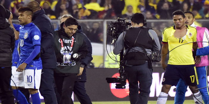 وكان داني ألفيش قد قام بتمريرة عرضية متقنة سددها نيمار برأسه قبل أن يتصدى لها الحارس الكولومبي لترتد مرة أخرى في يد النجم البرازيلي، وهو ما اعتبره حكم اللقاء تعمد من اللاعب لإيداع الكرة في الشباك باليد.ونال نيمار الإنذار الأول في مباراة البرازيل أمام بيرو عندما حاول نجم إزالة الرذاذ المتلاشي الذي كان يستخدمه حكم اللقاء في تحديد المسافات أثناء تنفيذ الضربات الحرة.