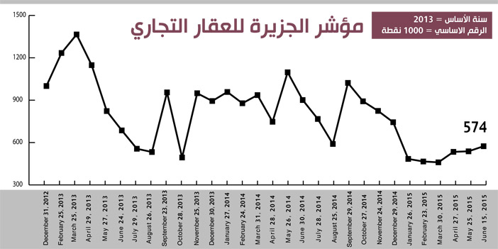 أغلق مؤشر الجزيرة للعقار التجاري الأسبوع الماضي عند مستويات 574 نقطة منخفضاً بنسبة 7 بالمائة، هذا وقد بلغ متوسط أخر ثلاثة أشهر لمؤشر الجزيرة للعقار التجاري 549 نقطة. وبالنظر إلى التغيّر في قيمة المؤشر منذ بداية العام الحالي فقط بلغت 22.8 بالمائة، حيث كانت قيمته بداية العام 744 نقطة، أي أن التراجع في المؤشر التجاري يفوق بكثير التراجع المؤشرات الأخرى، فيما بلغت نسبة الانخفاض في المؤشر التجاري من بداية التأسيس 42.6 بالمائة.