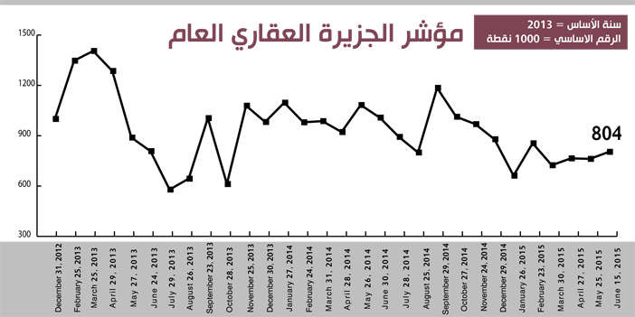 تراجع مؤشر الجزيرة العقاري العام (سكني تجاري) خلال الأسبوع الماضي إلى مستويات 804 نقطة منخفضاً بنسبة 11 في المائة، والجدير بالذكر أن متوسط آخر ثلاثة أشهر بلغ 787 نقطة، وجاء هذا التراجع من القطاعين السكني والتجاري. فيما بلغت نسبة انخفاض مؤشر الجزيرة العقاري منذ بداية العام 8.6 في المائة، حيث كانت قيمة المؤشر في بداية العام 879 نقطة، وبلغت نسبة الانخفاض في المؤشر من بداية تأسيسه (2013) 19.6 في المائة.