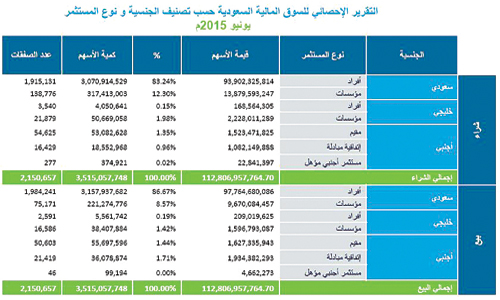 وأوضح تقرير السوق المالية المحلية حول التداول الإحصائي حسب الجنسية ونوع المستثمر أمس، أن القيمة الإجمالية للأسهم المتداولة خلال شهر يونيو الماضي 112.81 مليار ريال، بانخفاض قدره 30.54 % عن تداولات شهر مايو من 2015. وحول قيمة الأسهم المتداولة حسب الجنسية، أفاد التقرير بأن قيمة عمليات شراء «المستثمر السعودي» بلغت 107.78 مليار ريال أي ما تشكل نسبته 95.55 % من جميع عمليات السوق، فيما بلغت قيمة عمليات البيع 107.43 مليار ريال أي بنسبة 95.24 %، فيما بلغت قيمة عمليات شراء «المستثمر الخليجي» 2.40 مليار ريال أي بنسبة 2.12 %، فيما بلغت قيمة عمليات البيع 1.81 مليار ريال أي بنسبة 1.60 %.