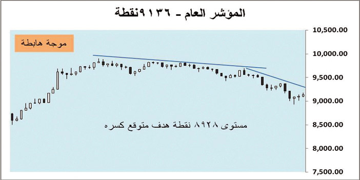افتتح المؤشر العام الأسبوع الماضي على هبوط، وصلت ذروته إلى مستوى 8928 نقطة، ثم ارتداد وإغلاق عند مستوى 9136 نقطة، وإنهاء الأسبوع على نمط بيعي في موجة هابطة؛ إذ خرج المؤشر العام الأسبوع المنصرم من قناة سعرية هابطة إلى قناة هابطة أكبر، وبسلوك حاد. وكانت المشاركة في الهبوط من معظم مكونات السوق، وخصوصاً سابك التي كسرت دعماً مهماً عند 99.5 ريال، والسيولة كانت في نمو مطرد تزامن مع الهبوط.
