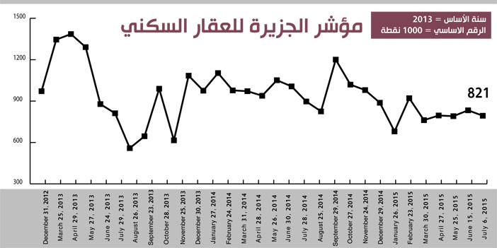 تراجع مؤشر الجزيرة للعقار السكني خلال الأسبوع الماضي بنسبة 4.6 بالمائة ليغلق عند مستويات 821 نقطة، مقارنة بـ 861 نقطة للأسبوع قبل الماضي، نتيجة تراجع المبيعات لأغلب مكونات المؤشر من أراضي وفلل وشقق، فيما بلغ متوسط مؤشر الجزيرة للعقار السكني خلال آخر ثلاثة أشهر 832 نقطة. وبلغت نسبة الانخفاض في المؤشر منذ بداية العام الحالي 10 بالمائة، حيث كانت قيمته 916، أما التغير من بداية التأسيس فقط بلغت 10.3 بالمائة.