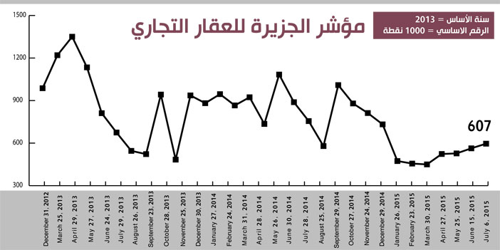 سجل مؤشر الجزيرة للعقار التجاري ارتفاعاً خلال الأسبوع الماضي بنسبة 5.7 بالمائة ليغلق المؤشر عند مستوى 607 نقطة مقارنة بـ بإغلاق 574 نقطة للأسبوع قبل الماضي، هذا وقد بلغ متوسط آخر ثلاث أشهر لمؤشر الجزيرة للعقار التجاري 557 نقطة. وبالنظر إلى التغير في قيمة المؤشر منذ بداية العام الحالي فقط بلغت 18.4 بالمائة، حيث كانت قيمته بداية العام 744 نقطة، فيما بلغت نسبة الانخفاض في المؤشر التجاري من بداية التأسيس 39.9 بالمائة.