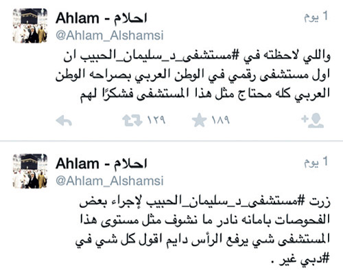 وتابعت أحلام التغريد قائلة «واللي لاحظته في مستشفى د. سليمان الحبيب إنه أول مستشفى رقمي في الوطن العربي، بصراحة الوطن العربي كله محتاج مثل هذا المستشفي فشكراً لهم»، وقد حظيت هاتان التغريدتان بردود أفعال قويّة ولاسيما من المتابعين السعوديين الذي أبدوا فخرهم بوجود استثمارات سعودية تتمتع بتلك السمعة المتميزة في مدينة دبي الطبية.