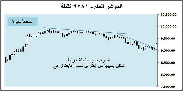 افتتح المؤشر العام الأسبوع الماضي على هبوط، وصلت ذروته إلى مستوى 9013 نقطة، ثم ارتداد سريع وإغلاق عند مستوى 9281 نقطة، وإنهاء الأسبوع على نمط شرائي في الموجة الهابطة الأسبوعية. لكن على مستوى الحركة اليومية دخل السوق في منطقة حيرة، وكان الدعم من شركات قيادية عدة، أبرزها سابك ومعادن والراجحي. والسبب الجوهري - من وجهة نظر خاصة - هو إعلان شركات نتائج مالية فاقت توقعات المتعاملين.
