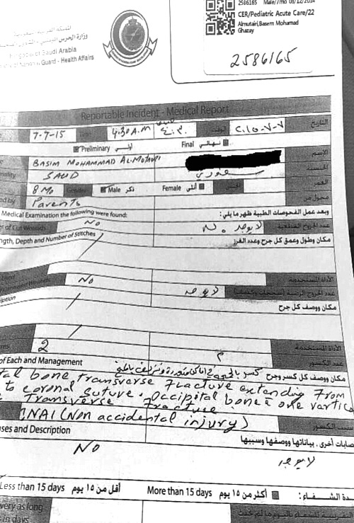 وفي تفاصيل الحادثة قال والد الطفل المصاب (ب. م. غ) لـ(الجزيرة) إن قصة تعذيب طفله بدأت قبل يوم من إدخاله المستشفى، حيث سافرنا من حائل للقصيم وتعب علينا هناك وسط نوبات بكاء متواصلة ثم توجهنا للرياض والطفل نائم لساعات على غير العادة توجهنا به لمستشفى الحرس الوطني وعمل أشعة على الرأس وهنا انكشف التعذيب الذي مارسته الخادمة بطريقة لم تظهر لنا أي علامات لهذا التعذيب، حيث أفادنا الأطباء بعد الأشعة بوجود عدد من الكسور في الجمجمة أحدها قبل يوم من إدخاله المستشفى والباقي جديدة لم يمض عليها ساعات وكذلك نزيف بالدماغ.