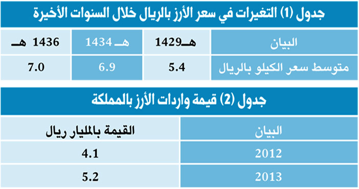 يعتبر الأرز المكون الغذائي الأول بالمملكة، ومن أهم السلع الغذائية داخل سلة الواردات المحلية، وتتطور واردات المملكة من الأرز سنوياً بشكل كبير، ففي حين بلغت قيمة واردات الأرز خلال عام 2012م حوالي 4.1 مليارات ريال، أو ما يعادل 1.2 مليون طن يتم استيرادها سنوياً ارتفعت إلى حوالي 5.2 مليارات ريال عام 2013م (بكمية بلغت 1.24 مليون طن) ، محرزاً زيادة بنسبة 27% عن مستوى 2012م. هذه الزيادة، نجمت عن ارتفاعات في مستويات أسعار الاستيراد أكثر منها ارتفاعاً نتيجة زيادة في كمية الواردات. فقد تطور سعر استيراد طن الأرز من 3.417 ريالاً في 2012م إلى حوالي 4.194 ريالاً عام 2013م.