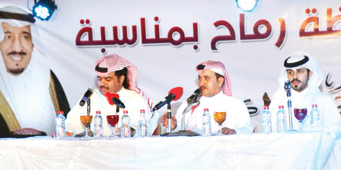 وبعد ذلك ألقى سلطان بن محمد المطوع كلمة تحدث فيها عن أهمية تعزيز أواصر المحبة وصلة الرحم بالعيد، ثم ألقى كل من الشعراء عبدالعزيز سلمان الفراج السبيعي، وعبدالرحمن بن بديع، وسعود بن شاهر السبيعي، وعبدالله بداح الدوسري، قصائد شعرية نالت استحسان الحضور. وبعد ذلك شارك الجميع بالعرضة السعودية، ثم قدم أوبريت وطني من أداء المنشد البارق السبيعي، ثم تم تكريم الداعمين للحفل، وهم رئيس بلدية رماح، وزيد المليحي، وناصر بن مهنا، وسلمان الفراج، وعلوش بن عبدالله ابوثنين، ومسلم بن سعد ابوثنين، وناصر ذعذاع ابوثنين، وفرع الغرفة التجارية برماح. كما تم تكريم الشعراء المشاركين، ثم السحب على الجوائز الثمينة المقدمة للجمهور، وبعد ذلك أقيمت أمسية شعرية، وبعدها ختم بفقرة الفنون السعودية الفلكلورية.