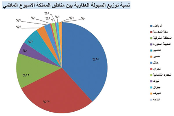 أما بالنسبة لتوزيع قيمة التداولات العقارية بحسب مناطق المملكة الأسبوع الماضي، فقد جاءت الرياض بالمرتبة الأولى وبقيمة 311 مليون ريال، حيث كان نصيبها من السيولة العقارية 38 في المائة وجاءت منطقة مكة المكرمة في المرتبة الثانية وبنسبة 29 في المائة وبما قيمته 238 مليون ريال، والمنطقة الشرقية بالمرتبة الثالثة 13 في المائة بقيمة 102 مليون ريال، واحتلت منطقة القصيم المرتبة الرابعة بقيمة 50 مليون ريال.