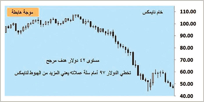 أنهى خام نايمكس أسبوعا سلبيا وبنمط بيعي قوي بعد أن تذبذب بين مستوى 46.5 دولار و 49.5 دولار مؤكداً قوة الموجة الهابطة له على مستوى الحركة الأسبوعية. والملفت أن هذا الهبوط الأخير في نايمكس لم يكن بسبب الدولار حيث إن الدولار لم يضف شيئاً جديداً في حركته الصعودية، لكن يبدو بأن المؤشرات الاقتصادية الصينية السلبية بدأت تتواتر وتتفق فيما بينها لإرسال رسالة للاقتصاد العالمي بأنه حان وقت انتهاء الدورة الاقتصادية للتنين.