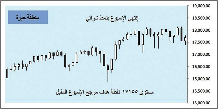 افتتح مؤشر الداوجونز الأسبوع على هبوط بلغ قاعه عند مستوى 17399 نقطة يليه ارتداد وإغلاق عند مستوى 17689 نقطة بنمط شرائي ضمن منطقة الحيرة على مستوى الحركة الأسبوعية، وكانت أهم الأسباب الداعمة للشراء طمأنة الفدرالي الأمريكي للمستثمرين بأن الاقتصاد ينمو بشكل جيد دون رفع لسعر الفائدة على الدولار، لكن لا ننسى أن التأثير الجوهري لضعف الداوجونز مؤخراً كان بسبب سلبية النتائج المالية للشركات الأمريكية.
