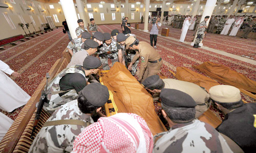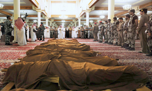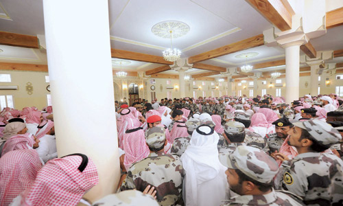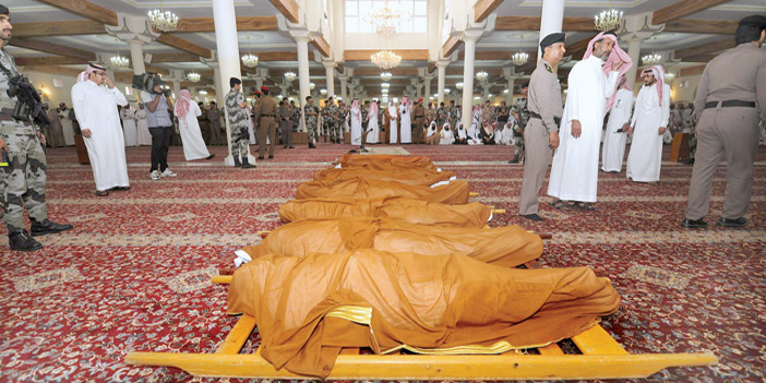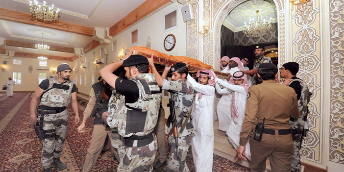 وأدى الصلاة مع سمو الأمير فيصل بن خالد، معالي مدير الأمن العام الفريق الركن عثمان بن ناصر المحرج، ومعالي نائب مدير عام المباحث الفريق عبدالله القرني، وقائد قوة الطوارئ الخاصة بالمملكة اللواء ركن خالد بن قرار الحربي، ومدير شرطة منطقة عسير اللواء محمد بن عبدالله أبو قرنين، وعدد من القيادات الأمنية ومديري الإدارات الحكومية في المنطقة وذوي الشهداء وجموع غفيرة من المواطنين. وعقب أداء صلاة الميت على الشهداء، قدم صاحب السمو الملكي الأمير فيصل بن خالد بن عبدالعزيز أمير منطقة عسير، التعازي والمواساة لأسر وذوي الشهداء، سائلاً الله تعالى للشهداء المغفرة والرحمة، وأن يلهم أهلهم وذويهم الصبر والسلوان.