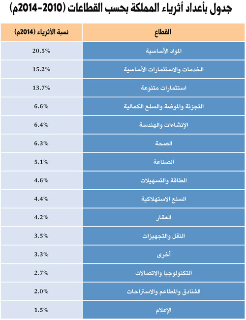 قطاع المواد الأساسية كان المورد الرئيس للثروة لنحو 20.5 بالمائة من أثرياء المملكة في العام 2014م، فيما احتل قطاع الخدمات المالية والاستثمار المركز الثاني، كمورد رئيس للثروة لنحو 15.2 بالمائة في العام 2014م، تلاه قطاع التجزئة والموضة والسلع الكمالية بنسبة 6.6 بالمائة، ثم الإنشاءات والهندسة بنسبة 6.4 بالمائة.