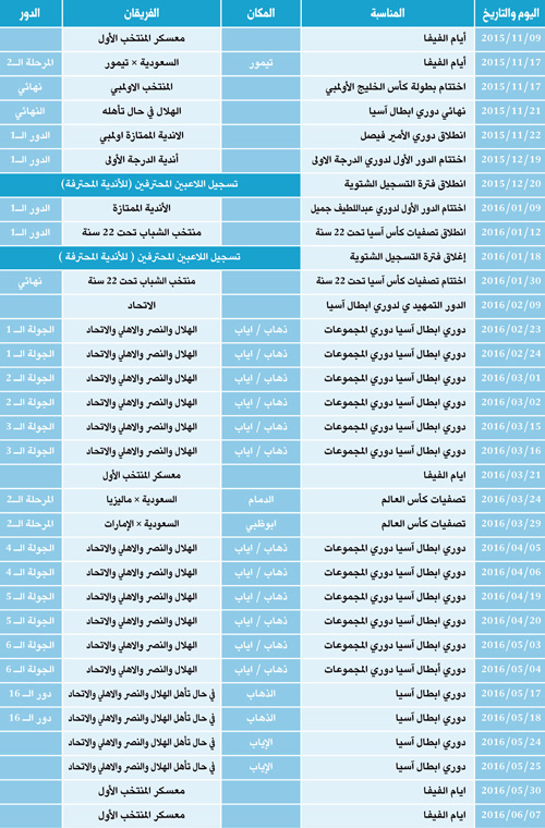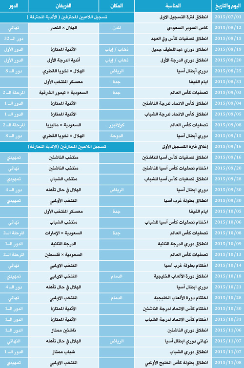 يشهد الموسم الرياضي الذي سينطلق قريبا العديد من المشاركات سواء على مستوى المنتخبات الوطنية التي تتمثل في مشاركة المنتخب الأول في تصفيات كأس العالم الذي سيقابل فيها منتخبات فسلطين والإمارات وتيمور الشرقية وماليزيا، ومشاركة المنتخب الاولمبي في بطولة غرب آسيا ودورة الألعاب الخليجية وكأس الخليج الأولمبي، ومنتخب الشباب في تصفيات كأس آسيا تحت 22 سنة وتصفيات كأس آسيا، ومنتخب الناشئين في تصفيات كأس آسيا، إضافة الى أيام الفيفا التي ستتوقف فيها مشاركات الأندية، وستكون أيام الفيفا ضمن استعدادات المنتخب لتصفيات كأس العالم، إضافة إلى مشاركة الهلال في دوري ابطال آسيا في نسختها الحالية التي سيقابل فيها فريق لخويا القطري ثم نصف النهائي والنهائي في حال وصوله، إضـافة الى مشاركات الاندية السعودية في دوري أبطـال آسـيا في نسختهـا القـادمة التي يشارك فيها فريق الاتحاد «في الملحق» إضافة الى النصر والهلال والاهلي في دوري المجموعات.