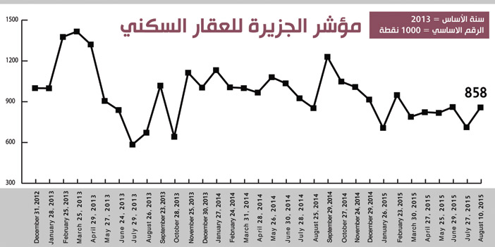واصل مؤشر الجزيرة العقاري ارتفاعه للأسبوع الثاني على التوالي ليغلق عند 792 نقطة، مقارنة بإغلاق 724 نقطة للأسبوع قبل الماضي مرتفعاً بنسبة 9.3 بالمائة، وجاء هذا الارتفاع نتيجة ارتفاع القطاعين السكني والتجاري، حيث جاء الارتفاع الأكبر في منطقتي الرياض ومكة المكرمة، وبلغ متوسط قيمة المؤشر لآخر ثلاثة أشهر 778 نقطة.