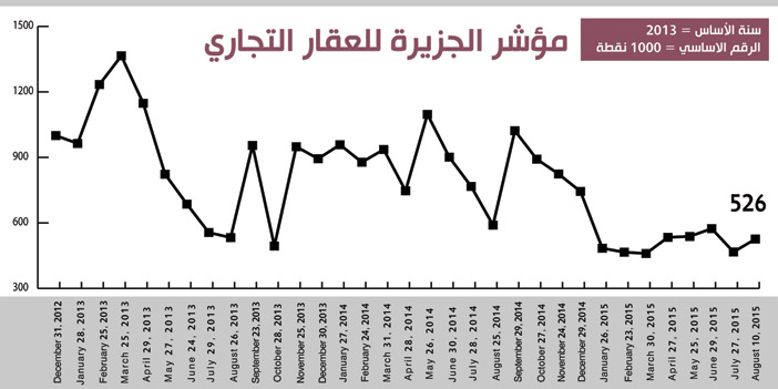 حقق مؤشر الجزيرة للعقار التجاري خلال الأسبوع الماضي ارتفاعا بنسبة 10.6 بالمائة ليغلق المؤشر عند مستوى 526 نقطة، مقارنة بإغلاق 475 نقطة للأسبوع قبل الماضي، وعلى الرغم من الارتفاع ما زال المؤشر التجاري يتداول تحت متوسط قيمته لآخر ثلاثة أشهر عند مستويات 560 نقطة. أما التغير في قيمة المؤشر منذ بداية العام فقد بلغت نسبة الانخفاض 29.4 بالمائة، حيث كانت قيمته بداية العام 744 نقطة، فيما بلغت نسبة الانخفاض في المؤشر التجاري من بداية التأسيس 47.4 بالمائة.