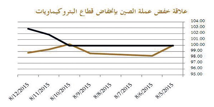 ولفت التقرير، إلى أن قطاع البتروكيماويات يشمل 14 شركة، وبالرغم من أن شركتين منها لا تصدر للصين خصوصاً وآسيا عموماً، وهما شركة نماء للكيماويات وشركة الصحراء للبتروكيماويات، إلا أن بقية شركات القطاع تستهدف أسواق مختلفة ولكن آسيا تمثل النسبة الأكبر. وتابع»لذا نرى التذبذب في أسعار أسهم هذه الشركات بعد إعلان الصين لخفض عملتها، الأمر الذي يعكس مخاوف المستثمرين تجاه انخفاض نمو مبيعات هذه الشركات».