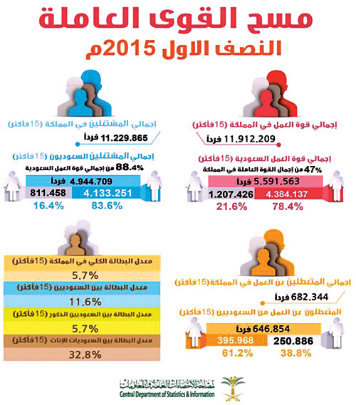 من جهة أخرى، أظهرت نتائج مسح القوى العاملة للنصف الأول من 2015 أن إجمالي قوة العمل في المملكة بلغ 11.912.209 أفراد، فيما بلغ إجمالي المشتغلين 11.229.865 فرداً، ليسجل معدل البطالة الإجمالي في المملكة 5.7 في المائة، فيما بلغ معدل البطالة بين السعوديين 11.6 في المائة مسجلا 5.7 في المائة بين الذكور، و32.8 في المائة بين الإناث.