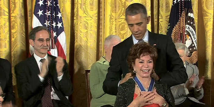 ألليندي: كانت في السابعة أو الثامنة من العمر، وكان الموضوع عن العائلة. اتصلت بي المعلمة، وقالت لي إنها كتبت: «عائلتي ليست مهمة. الشخص الوحيد المهم في عائلتي هي جدتي؛ لأنها تمتلك خيالاً كبيراً»! سألتُ حفيدتي عن معنى «خيال كبير»، قالت: «أنتِ تستطيعين تذكر أشياء لم تحدث»! وهذه هي.. [مقاطعة]