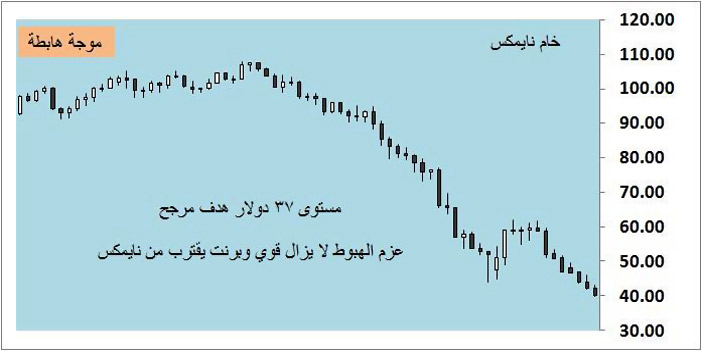 أسبوع سلبي جداً لخام نايمكس حيث تذبذب بين 43 و 39 دولاراً وبنمط بيعي قوي وكسر للقاع السنوي 42 دولاراً رغم استقرار العملة الخضراء لكن السبب الرئيسي لهبوطه هو تراجع شهية المخاطرة في الأسواق وركود الاقتصاد الصيني، ويرجح الأسبوع القادم أن يواصل خام نايمكس هبوطه إلى مستوى 37 دولارا ًلكن الأهم من ذلك هو متابعة خام برنت الذي من الممكن يهبط بوتيرة أعلى وعليه تتقلص الفجوة السعرية مع نايمكس أكثر.