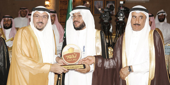 رعى أمير منطقة القصيم صاحب السمو الملكي الأمير فيصل بن مشعل بن سعود بن عبد العزيز مساء يوم الأربعاء الماضي اليوم الذهبي لمهرجان تمور رياض الخبراء وكان في استقباله المحافظ فهد السلطان ومعالي الشيخ عبد الله المحيسن رئيس محكمة الاستئناف بالقصيم وسعادة أمين القصيم بالنيابة المهندس عبد العزيز المهوس ورئيس البلدية المهندس عبد القادر المشيقح والرئيس التنفيذي للمهرجان عبد الرحمن الشايع وأعضاء المجالس المحلية والبلدية والتنمية وعدد من رؤساء الدوائر، حيث قام سموه بجولة على المهرجان بدأها بسوق التمور والأسر المنتجة والحرف والسواني، ثم بدئ الحفل الخطابي بالقرآن الكريم، ثم كلمة المحافظ الأستاذ فهد السلطان، فقصيدة للشاعر عبد الله الدواس نالت قبول الأمير والحضور، ثم كلمة المزارعين لـ د. عبدالله الحماد، ثم حوار بين النخلة وإرهابي لـ د. محمد الرشيد، ثم قصيدة للشاعر محسن عوض، فاوبريت للمنشدين عبد الله السكيتي ومحمد العريني، فعرض مرئي لقصة المهرجان ومراحل نجاحه.. في نهاية الحفل كرَّم الأمير المنظمين والرعاة والراعي الإعلامي صحيفة الجزيرة وتسلّم درع التكريم الزميل صالح الدواس مدير مكتب الجزيرة في رياض الخبراء.