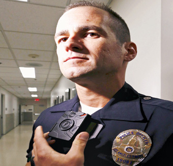 ضابط أمريكي يعرض كاميرا توضع على صدر أفراد الشرطة في لوس أنجليس، تسجِّل بالصوت والصورة ما يدور بين الشرطي والمتهم في الشارع؛ لتكون دليلاً على ما يجري في الشارع، بعد غياب الدليل القاطع على مجريات بعض الأحداث التي يعتقد أن ضحايا راحوا فيها بسبب عنف الشرطة.