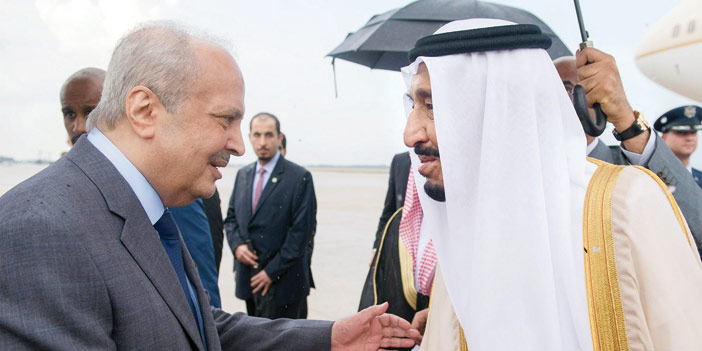 وكان في استقباله - رعاه الله - بمطار قاعدة اندروز الجوية معالي وزير الخارجية الأمريكي جون كيري، وعدد من المسؤولين. كما كان في استقبال الملك المفدى، صاحب السمو الأمير عبدالله بن فيصل بن تركي وأصحاب السمو الأمراء ومديرو المكاتب السعودية في الولايات المتحدة الأمريكية وعدد من كبار المسؤولين. ويضم الوفد المرافق بمعية خادم الحرمين الشريفين، صاحب السمو الملكي الأمير عبدالإله بن عبدالعزيز آل سعود مستشار خادم الحرمين الشريفين، وصاحب السمو الأمير خالد بن فهد بن خالد، وصاحب السمو الملكي الأمير منصور بن سعود بن عبدالعزيز، وصاحب السمو الملكي الأمير طلال بن سعود بن عبدالعزيز، وصاحب السمو الملكي الأمير سعود بن فهد بن عبدالعزيز وصاحب السمو الملكي الأمير الدكتور حسام بن سعود بن عبدالعزيز، وصاحب السمو الملكي الأمير محمد بن عبدالرحمن بن عبدالعزيز، وصاحب السمو الملكي الأمير عبدالعزيز بن سعود بن نايف بن عبدالعزيز، وصاحب السمو الملكي الأمير أحمد بن فهد بن سلمان بن عبدالعزيز، وصاحب السمو الملكي الأمير تركي بن هذلول بن عبدالعزيز، وصاحب السمو الملكي الأمير عبدالمجيد بن عبدالإله بن عبدالعزيز وصاحب السمو الملكي الأمير راكان بن سلمان بن عبدالعزيز. كما وصل في معيته - رعاه الله - معالي رئيس الشؤون الخاصة لخادم الحرمين الشريفين الأستاذ حازم بن مصطفى زقزوق، ومعالي رئيس المراسم الملكية الأستاذ خالد بن صالح العباد، ومعالي نائب السكرتير الخاص لخادم الحرمين الشريفين مساعد رئيس الديوان الملكي للشؤون التنفيذية الأستاذ فهد بن عبدالله العسكر، ومعالي رئيس الحرس الملكي المكلف الفريق أول حمد بن محمد العوهلي، ومعالي مساعد السكرتير الخاص لخادم الحرمين الشريفين الأستاذ تميم بن عبدالعزيز السالم ومعالي نائب رئيس هيئة الأركان العامة الفريق ركن فياض بن حامد الرويلي.