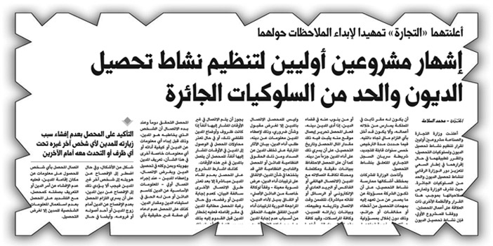 وراعت الوزارة في تعديل اللائحة، التي تحوي 16 مادة تبين أحكام الترخيص وسجل قيد المحصلين وممارسة الشركات للنشاط وآلية التحقق من المدين وقبض الدين، أفضل التشريعات والممارسات الدولية وبما يتناسب مع البيئة المحلية، كما راعت آراء العموم من متخصصين ومسؤولين في القطاعات ذات العلاقة، وذلك بعد أن طرحت مشروع اللائحة لاستطلاع آراء العموم.. حيث تشرف الوزارة وتمارس صلاحياتها بموجب هذا القرار والتشريعات الأخرى ذات العلاقة على أعمال المحصلين.