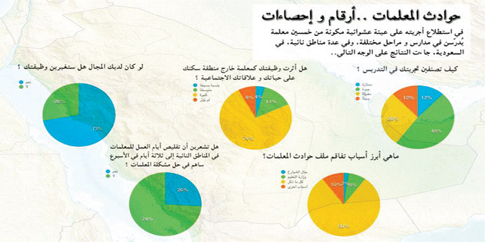 وعن مدى رضى المعلمات عن وظيفتهن الحالية، تطلعت 72 في المئة من المعلمات إلى تغيير وظيفتهن، إن سنحت لهن فرصة في المستقبل، في حين أكدت 28 في المئة من النسبة المتبقية عدم رغبتهن في تغيير وظيفتهن.