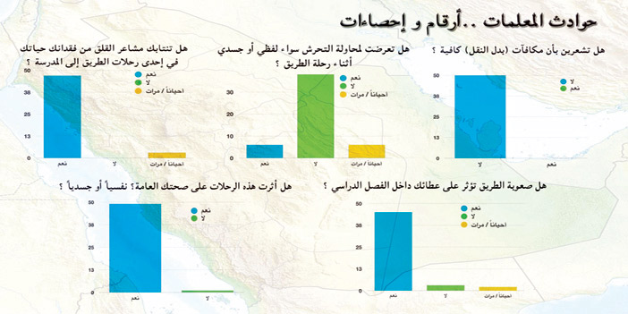 كشف استبيان أجرته معدة التحقيق مع خمسين معلمة يعملن في قرى نائية، أن 97 في المئة من المعلمات يشعرن بالقلق من فقدان حياتهن في إحدى رحلات الطريق إلى المدرسة، في حين أكدت النسبة ذاتها أن رحلات الطريق أثرت على صحتهن العامة نفسياً أو جسديا، بالإضافة إلى أن نسبة 74 في المئة من المعلمات يعتقدن أن وظيفتهن كمعلمات خارج منطقة سكنهن لعبت دوراً سلبياً على حياتهن بنسبة كبيرة، في حين أثر ذلك بنسبة متوسطة على 14 في المئة منهن.