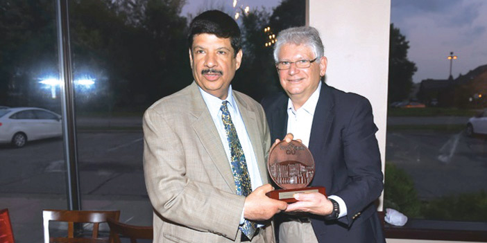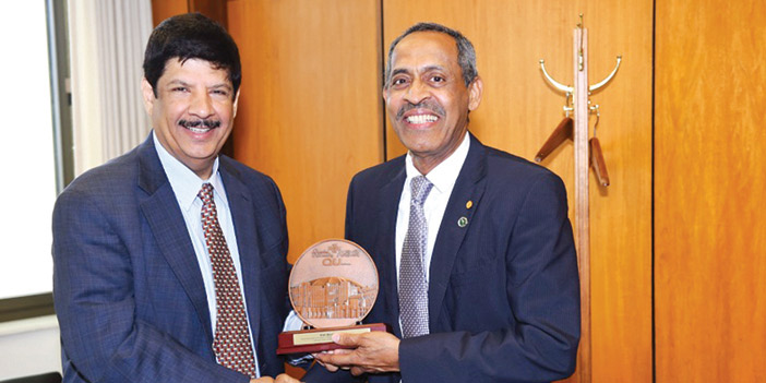 ** الأستاذ الدكتور خالد الحمودي كرم البروفيسور فرانك فيير وكيل كلية الزراعة والموارد الطبيعية بجامعة ميتشيجان سابقاً إبان توقيع الاتفاقية، المشرف على رسالة الدكتوراه لمعاليه «خريج كلية الزراعة بالجامعة ذاتها», وذلك خلال لقاء ودي تم خلاله استذكار العديد من المواقف الدراسية الجميلة التي جمعتهما خلال تلك الفترة. كما بادله البروفيسور فرانك تقديم الهدايا التذكارية.
