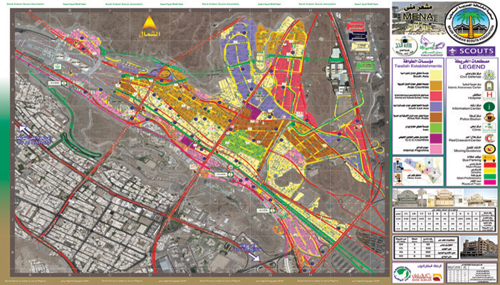 أصدرت جمعية الكشافة العربية السعودية ست خرائط إرشادية، أعدتها بمعسكرات الخدمة العامة في مكة المكرمة والمشاعر المقدسة، وجرى إسقاطها من برنامج قوقل إيرث للمنطقة المركزية بمكة المكرمة «الحرم المكي الشريف»، ولحي العزيزية، وتضمنت الطرق الرئيسة والشوارع الفرعية والفنادق والدوائر والأجهزة الحكومية، والمنطقة المركزية للمسجد النبوي الشريف، وخارطة عامة للمدينة المنورة، إضافة إلى مشعري منى وعرفات. وشهدت خرائط هذا العام تطوراً عن الأعوام السابقة في نظام الإحداثيات لتحديد المواقع من خلال وضع كتف للخريطة كجدول متكامل عن جميع الجهات الحكومية والأهلية الخدمية، ووضع الرقم المخصص بكل جهة على شعارها ليسهل على مستخدم الخريطة تحديد الموقع الذي يريد، إضافة إلى وضع دليل مؤسسات الطوافة عليها.