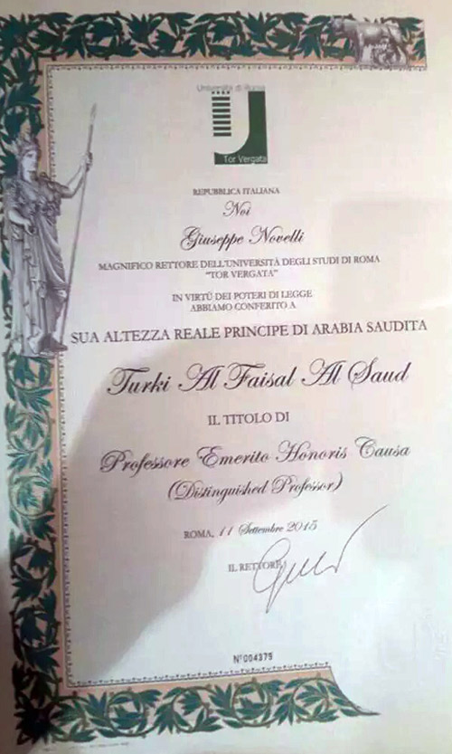 ألقى صاحب السمو الملكي الأمير تركي الفيصل محاضرة بعنوان: (أزمة الشرق الأوسط: رؤية سعودية)، وذلك بجامعة تورفيرغاتا الإيطالية، وذلك ضمن مراسم الجامعة لمنح سموه درجة أستاذ الفخرية والتي قام بتسليمها لسموه عميد الجامعة جوزيبي نوفيلي بحضور سفير خادم الحرمين الشريفين في إيطاليا الدكتور رائد قرملي، وعدد من السفراء العرب، ونخبة من طلبة الجامعة، وفيما يلي نص المحاضرة: