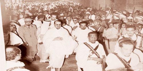 ففي يوم الخميس من غرة ذي الحجة عام 1374هـ الموافق 21 يوليه عام 1955م تحرك الموكب الملكي الكريم من القصر الملكي في جدة في طريقة إلى مكة المكرمة، وقد وصل الموكب إلى باب مكة في تمام الساعة الحادية عشرة بالتوقيت الغروبي، حيث كان في استقباله جمع كبير من الأهالي ثم أخذ طريقه حيث قصد مباشرة إلى المسجد الحرام وبعد أن طاف بالبيت العتيق خاشعاً مبتهلا إلى الله إلى أن أذن المغرب فأحاطت مجموعة من علماء المسلمين الذين وفدوا إلى هذه البلاد بقصد أداء فريضة الحج من مختلف الأقطار الإسلامية ورفعوا رجاءهم إلى جلالته أن يصلي بهم إماماً فما كان من جلالته إلا أن استجاب لرجائهم، حيث أمّ ذلك الجمع الحافل من المصلين ومن حجاج بيت الله الحرام مما كان له أكبر الأثر وأعظم الوقع في نفوس هؤلاء الحجاج.