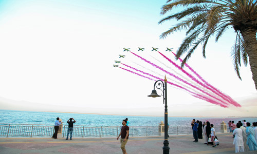 احتضنت سماء مدينة الجبيل الصناعية، ثاني أيام عيد الاضحى المبارك فريق الصقور السعودية؛ حيث قدم الفريق عرضاً جوياً على شواطئ مدينة الجبيل الصناعية قدم فيها العديد من التشكيلات الجوية الشيقة المليئة بفن الطيران الاستعراضي المتقن والمسافات المتقاربة والتي امتزجت بالألون الأبيض والأخضر والأحمر. العروض استمرت قرابة الساعة، وسط حضور جماهيري كبير جداً لم يسبق له مثيل من قاطني مدينة الجبيل الصناعية وزوارها، وساعد في استقطابهم ما تتميز به شواطئ مدينة الجبيل الصناعية التي يبلغ طولها 16 كيلو مترا مصممة على أحدث الطرز الهندسية، ووفرت فيها كافة الخدمات من مسطحات خضراء تتخللها شجيرات زرعت بطريقة تتناسب مع المنظر الجمالي للمكان، وألعاب مخصصة للأطفال، وأخرى لذوي الاحتياجات الخاصة. بالإضافة إلى خدمة الانترنت اللاسلكي ودورات مياه بعمالة نظافة رجالية ونسائية.