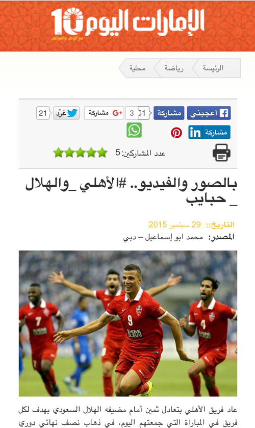 وأخيرا ذكر موقع سوبر الإلكتروني أن الأهلي الإماراتي قطع شوطاً كبيراً نحو التأهل للمباراة النهائية من البطولة الآسيوية بعد التعادل الإيجابي ذهاباً.