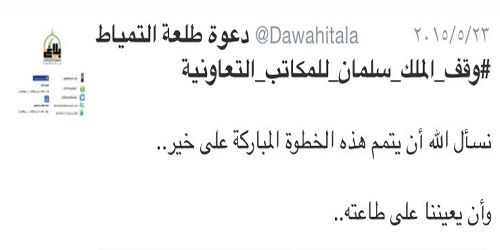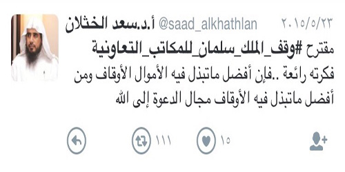 فكتب أ.د. سعد الخثلان: «مقترح وقف الملك سلمان للمكاتب التعاونية فكرته رائعة. فإن أفضل ما تبذل فيه الأموال الأوقاف ومن أفضل ما تبذل فيه الأوقاف مجال الدعوة إلى الله»، وقال أ.د. محمد الخضيري: «قلّ أن تجد مكتباً تعاونياً للدعوة إلا وفي ميزانيته عجز، ولذا فهم يتشوقون بلهفة لوقف الملك سلمان للمكاتب التعاونية.. وإن غداً لناظره قريب، ويتمنى أ. د. أحمد الباتلي أن يتحقق فسلمان ملك كريم محب للدعوة ورئاسته لجمعيات البر خير شاهد، ويقول عبدالعزيز القرعاوي: «النجاحات الحالية التي تحققها المكاتب التعاونية وعلى موارد قليلة، فكيف سيكون حالها بعد وقف الملك سلمان للمكاتب التعاونية، ويشير يزيد السديس: أن القائمين على المكاتب الدعوية يتطلعون اعتماد وإنشاء وقف الملك سلمان للمكاتب التعاونية.. اللهم دلّهم على كل خير وسددهم، ويؤكد خالد الفليح: أن إنشاء وقف الملك سلمان للمكاتب التعاونية سيحقق ـ بإذن الله ـ نقلة نوعية لمكاتب الدعوة لمعالجة جانب من نقص الموارد ولتتفرغ المكاتب للعمل الدعوي، أما أحمد البريكان فقال: الدعوة بأمس الحاجة وهذا يكفيها العجز ويكون لها عوناً للتطور، ويوضح أبوحاتم القحطاني: إذا ذكرت جهود مكافحة الإرهاب بمفهومه الشرعي الصحيح تجدها في المقدمة عبر مناشط وبرامج متنوعة ومؤثرة تقوم بها المكاتب التعاونية، وكتب حمد العمر: تمكين مكاتب الدعوة لتحقيق أثرها يحتاج وقف الملك سلمان للمكاتب التعاونية، ويؤكّد أحمد مكي: الأوقاف في الدعوة من أجلّ الأعمال وأعظمها نفعاً ويغفل عنها كثير من الناس، ولذا سيكون «وقف الملك سلمان للمكاتب التعاونية» في أحسن المصارف، وقال خالد الحيدر: وقف الملك سلمان للمكاتب التعاونية سيعيد للعمل الدعوي قوّته ونشاطه بإذن الله، فجزى الله صاحب الفكرة ومنفذه والعاملين عليه، ويقول منذر الغامدي: اقتراح نأمل أن يكون واقعاً وليس بمستغرب على سلمان الخير أن يدعم الدعوة إلى الله وسيرته عطرة بذلك، أما ماجد أبا الخيل فقال: المكاتب التعاونية لها جهود كبيرة في خدمة الدين وحماية المجتمع، وليس لها مخصصات رسمية لذا نتمنى تبني مبادرة وقف الملك سلمان للمكاتب التعاونية، ويقول فهد العيبان: هذا المشروع إن تم فهو خطوة رائدة وموفقة، نسأل الله الكريم أن يبارك فيها. جزى الله خيراً من أمر وتسبب بها، وكتبت د. خديجة محمد: مقترحا في محله وقف وميزانية سنوية للمكاتب التعاونية عمل جليل وغير مستحيل.