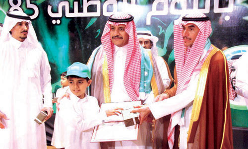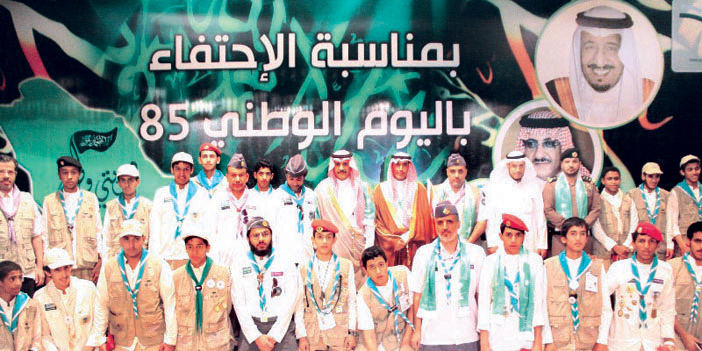وأكد ان التعليم يحظى منذ تأسيس المملكة وحتى يومنا هذا باهتمام قادتنا. بعد ذلك قدم الطالب محمد الحنو نشيداً وطنياً بعنوان (وطن الشموخ) ثم قصيدة للطالب سعد العبدالجبار ( وطني قبلة المسلمين ) تلاه تكريم الكشافة المشاركين في خدمة ضيوف الرحمن هذا العام، ثم قدم طلاب ثانوية الملك فهد بالمجمعة لوحة القائية بعنوان ( هويتي وطني ) ثم شارك المواطن محمد الحربي بقصيدة بهذه المناسبة تلاها رسالة إلى جنودنا البواسل من طلاب مدارس محافظة المجمعة قدمها الطالب ريان ابن الأمير.