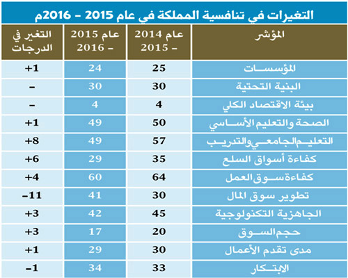 أظهر تقرير التنافسية العالمي لمنتدى دافوس لعام 2015/ 2016م أن المملكة العربية السعودية احتلت المرتبة الـ(25) عالمياً متأخرة درجة عن العام الماضي، ونحو (8) درجات عن عام 2011 -2012م.
