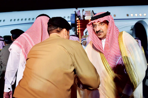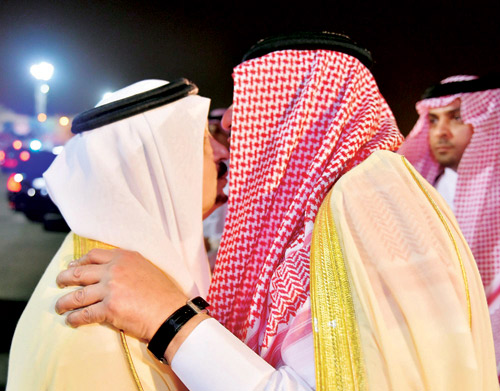 وقد وصل بمعية سمو ولي العهد، صاحب السمو الملكي الأمير تركي بن محمد بن فهد بن عبد العزيز، وصاحب السمو الملكي الأمير عبد العزيز بن سعود بن نايف بن عبد العزيز، ومعالي المستشار بالديوان الملكي الاستاذ عبد الله بن عبد الرحمن المحيسن ومعالي رئيس الشؤون الخاصة لسمو ولي العهد الاستاذ سليمان بن نايف الكثيري.