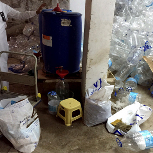 فيما بين بأنه تم دهم الموقع بمشاركة دوريات الأمن وبعد عملية التفتيش عثر على كميات كبيرة من عبوات المياه الفارغه وملصقات مزورة لمياه زمزم.